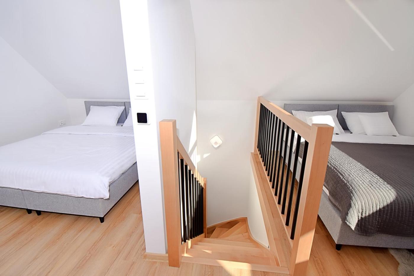 Apartament typu Superior. Jest to klimatyzowany apartament z prywatnym wejściem. Mieści on salon, oddzielną sypialnię oraz łazienkę z wanną lub prysznicem i suszarką do włosów. Posiłki można przygotowywać w kuchni z płytą kuchenną, lodówką, zmywarką do naczyń oraz przyborami kuchennymi. Pozostałe udogodnienia obejmują taras z widokiem na jezioro, część wypoczynkową oraz telewizor. W tej opcji zakwaterowania dostępne są 4 łóżka. Apartament - 5 osobowy. Powierzchnia pokoju ok.: 48 mkw.